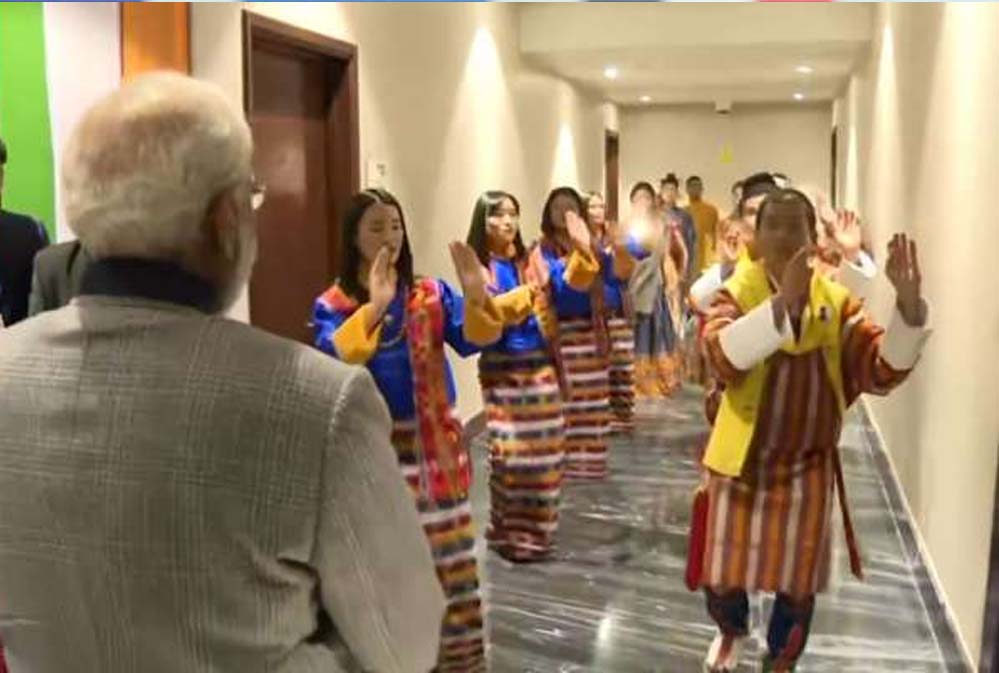 अधिकारियों ने बताया कि इस यात्रा के दौरान मोदी का विशेष स्वागत किया गया। भूटान के युवाओं के एक समूह ने हाल में मोदी द्वारा लिखे एक गीत पर गरबा किया।
