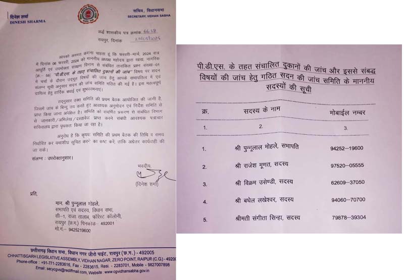 छत्तीसगढ़ विधानसभा अध्यक्ष डा. रमन सिंह के आदेश पर विधानसभा सचिव ने आखिरकार तत्कालीन खाद्य मंत्री अमरजीत भगत के मंत्रित्व काल में छह अरब के राशन घोटाले के लिए विधानसभा जांच समिति की घोषणा कर दी। पांच सदस्यो की समिति के सभापति पूर्व खाद्य मंत्री पुन्नू लाल मोहिले को बनाया गया है। समिति में दो अन्य पूर्व मंत्री राजेश मूणत और विक्रम उसेंडी को रखा गया है। कांग्रेस के लखेश्वर बघेल और संगीता सिन्हा को जांच समिति में  सदस्य बनाया है। समिति के सचिव दिनेश शर्मा, विधानसभा सचिव रहेंगे।