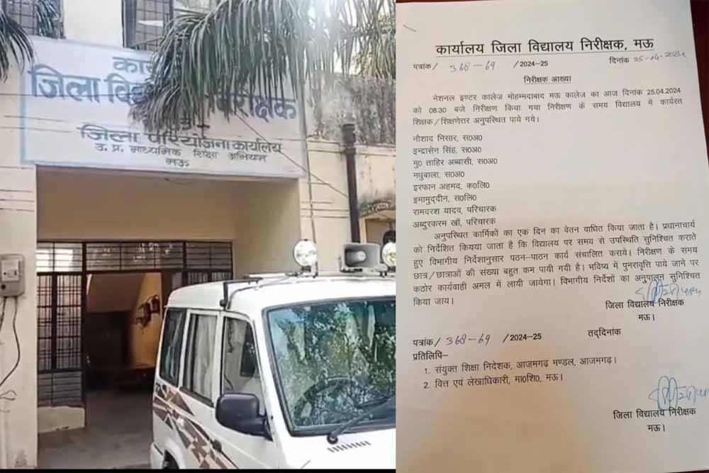 जिला विद्यालय निरीक्षक मऊ के द्वारा नेशनल इंटर कॉलेज मोहम्मदाबाद गोहना का औचक निरीक्षण किया गया। जिसमें विद्यालय के शिक्षक सहित 8 लोग अनुपस्थित पाए गए। सुबह 8:30 पर विद्यालय के निरीक्षण में अनुपस्थित पाए गए सभी शिक्षक और कर्मचारियों का एक दिन का वेतन काटने के साथ ही जिला विद्यालय निरीक्षक ने नोटिस जारी किया है कि भविष्य में ऐसी स्थिति की पुनरावृत्ति गई तो विभागीय कार्रवाई की जाएगी।