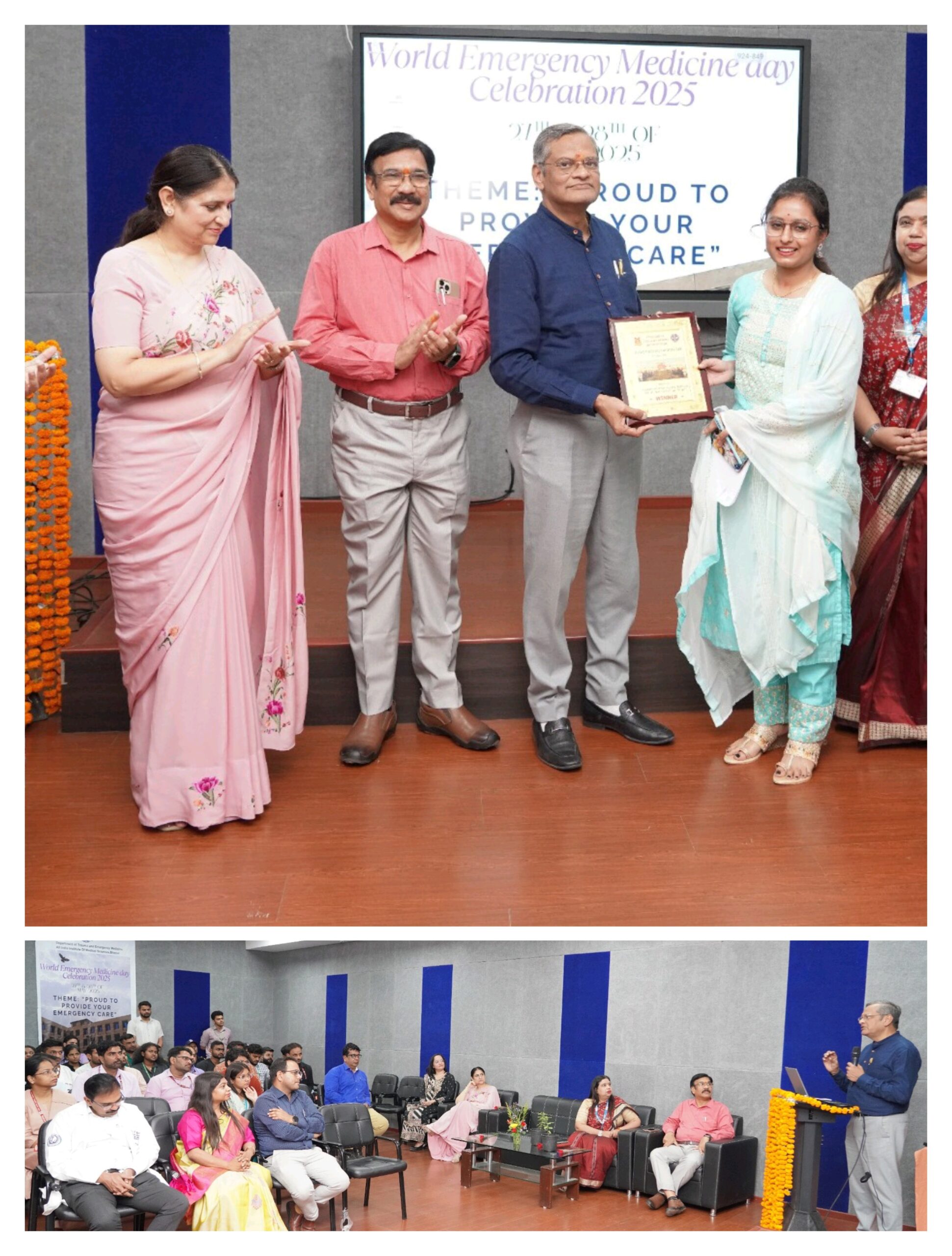 इस अवसर पर कार्यपालक निदेशक प्रो. (डॉ.) अजय सिंह ने कहा, “आपातकालीन चिकित्सा प्रणाली किसी भी स्वास्थ्य सेवा ढांचे की रीढ़ होती है। यह न केवल त्वरित निर्णय क्षमता की मांग करती है, बल्कि एक मजबूत टीम, प्रशिक्षण और प्रणालीगत समर्थन की भी आवश्यकता होती है।” ट्रॉमा एवं आपातकालीन चिकित्सा विभाग के प्रमुख प्रो. (डॉ.) मोहम्मद यूनुस ने कहा, “यह कार्यक्रम उन योद्धाओं को सम्मान देने का प्रयास है, जो सीमित संसाधनों में भी प्रतिदिन जीवन बचाते हैं और जिनके लिए सम्मान व सतत सहयोग आवश्यक है।” कार्यक्रम में विशिष्ट अतिथि के रूप में प्रो. (डॉ.) मनीषा श्रीवास्तव (निदेशक, बीएमएचआरसी, भोपाल), डॉ. प्रभाकर तिवारी (मुख्य चिकित्सा एवं स्वास्थ्य अधिकारी, भोपाल), डॉ. रूचि टंडन (विभागाध्यक्ष, इमरजेंसी मेडिसिन, जीएमसी भोपाल) एवं डॉ. शहताज खान की गरिमामयी उपस्थिति रही। कार्यक्रम का संचालन डॉ. रश्मि वर्मा द्वारा किया गया। साथ ही विभाग के संकाय सदस्य डॉ. भूपेश्वरी पटेल, डॉ. अमित प्रियदर्शी एवं डॉ. श्रुति दुबे ने पैनल चर्चाओं में सक्रिय सहभागिता की। समापन सत्र में प्रतिभागियों को पुरस्कार एवं प्रशंसा पत्र प्रदान किए गए।