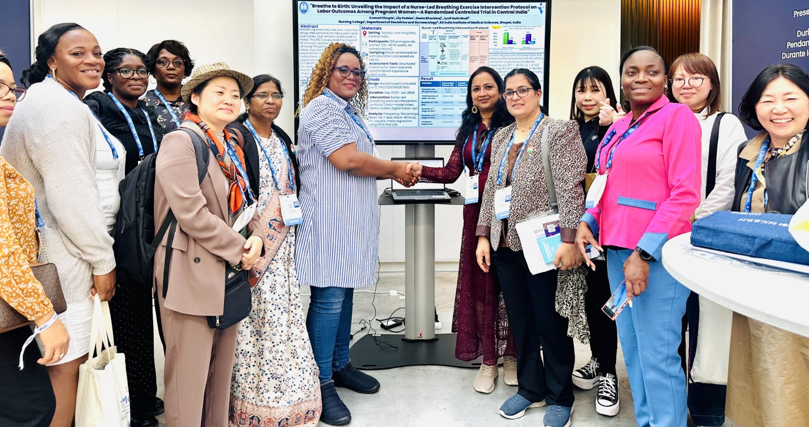 डॉ. लिली पोद्दार ने इस मंच पर एक वैज्ञानिक ई-पोस्टर प्रस्तुत किया, जिसका शीर्षक था – “ब्रीद टू बर्थ: अनवीलिंग द इम्पैक्ट ऑफ़ अ नर्स-लेड ब्रीदिंग एक्सरसाइज़ इंटरवेंशन प्रोटोकॉल ऑन लेबर आउटकम्स अमंग प्रेग्नेंट वीमेन- अ रैंडमाइज़्ड कंट्रोल्ड ट्रायल इन सेंट्रल इंडिया”। यह शोध एम.एससी. नर्सिंग की छात्रा कुमारी डिंपल (बैच 2022) के शोध प्रबंध पर आधारित था। इस अध्ययन में मध्य भारत के तृतीयक स्वास्थ्य संस्थानों में पहली बार गर्भवती होने वाली महिलाओं पर नर्सों द्वारा सिखाए गए एक विशेष श्वसन व्यायाम (सांस लेने की तकनीक) का प्रसव प्रक्रिया पर प्रभाव जांचा गया। शोध में यह पाया गया कि इस अभ्यास को अपनाने वाली महिलाओं को प्रसव के दौरान दवाओं की आवश्यकता कम पड़ी, प्रसव की अवधि घटी और उनका संपूर्ण अनुभव अधिक सहज और संतोषजनक रहा। इस शोध से यह सिद्ध हुआ कि नर्सों के नेतृत्व में कराए गए श्वसन अभ्यास कम लागत में, सरलता से लागू की जा सकने वाली प्रभावशाली रणनीति है, जो खासकर संसाधनों की कमी वाले क्षेत्रों में मातृ स्वास्थ्य को बेहतर बना सकती है। डॉ. लिली पोद्दार की इस प्रस्तुति को अंतरराष्ट्रीय प्रतिनिधियों द्वारा अत्यधिक सराहना मिली, जो मातृत्व देखभाल में नर्स-प्रेरित नवाचारों की वैश्विक स्वीकार्यता को दर्शाता है।।