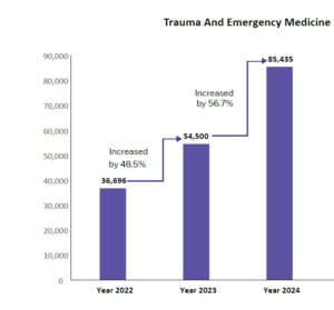 कार्यपालक निदेशक प्रो. (डॉ.) अजय सिंह के मार्गदर्शन में एम्स भोपाल के ट्रॉमा एवं इमरजेंसी चिकित्सा (TEM) विभाग में संरचनात्मक और संचालनात्मक सुधारों की एक श्रृंखला लागू की गई है, जिससे आपातकालीन सेवाओं की गुणवत्ता, त्वरितता और पहुंच में उल्लेखनीय वृद्धि हुई है। इन व्यापक सुधारों के परिणामस्वरूप विभाग में मरीजों की संख्या में लगातार बढ़ोतरी दर्ज की गई है, जो जनता के बढ़ते विश्वास का स्पष्ट संकेत है। वर्ष 2022 में TEM विभाग में कुल 36,696 मरीजों ने उपचार प्राप्त किया, जो वर्ष 2023 में बढ़कर 54,500 हो गया—यह 48.5% की वृद्धि है। इसके पश्चात वर्ष 2024 में यह आंकड़ा 85,435 तक पहुंच गया, जो वर्ष 2023 की तुलना में 56.7% की अभूतपूर्व वृद्धि को दर्शाता है। यह लगातार बढ़ती संख्या दर्शाती है कि एम्स भोपाल की इमरजेंसी सेवाओं को जनता ने कितनी गंभीरता और विश्वास के साथ अपनाया है। ट्रॉमा एवं इमरजेंसी विभाग में लागू किए गए प्रमुख सुधारों में 24×7 वरिष्ठ चिकित्सकों की ऑन-फ्लोर उपस्थिति, ‘नो रिफ्यूजल पॉलिसी’, समयबद्ध अंतरविभागीय प्रतिक्रिया तंत्र, रेफरल की ट्रैक की जाने वाली और दस्तावेजीकृत प्रणाली, और गंभीर मामलों की प्राथमिकता के लिए ऑफ-ऑवर के दौरान बाह्य रेफरलों की स्क्रीनिंग शामिल है।