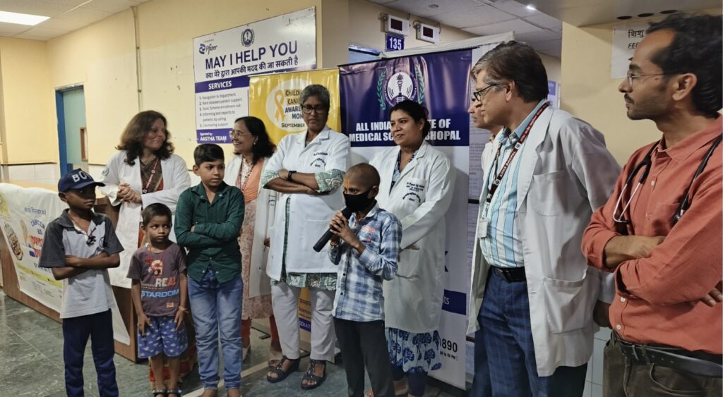 एम्स भोपाल में बाल कैंसर जागरूकता वार्ता आयोजित हुई, जिसमें डॉक्टरों, बच्चों, अभिभावकों और आमजन ने भाग लिया।