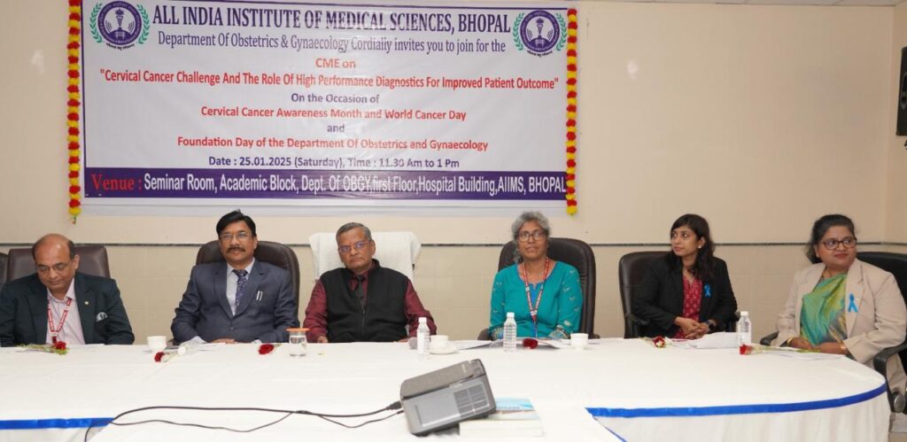 एम्स भोपाल के कार्यपालक निदेशक प्रो. (डॉ.) अजय सिंह के मार्गदर्शन में, 25 जनवरी 2025 को सर्वाइकल कैंसर जागरूकता माह और विश्व कैंसर दिवस तथा एम्स भोपाल के प्रसूति एवं स्त्री रोग विभाग के स्थापना दिवस के अवसर पर “सर्वाइकल कैंसर चुनौती और बेहतर रोगी परिणामों के लिए उच्च प्रदर्शन निदान की भूमिका” विषय पर एक सीएमई का आयोजन किया गया।