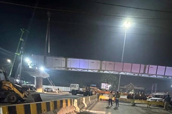 इंदौर खजराना चौराहे पर निर्माणाधीन फ्लाईओवर की एक भुजा के पियर तैयार होने पर गर्डर की लांचिंग की जा रही...