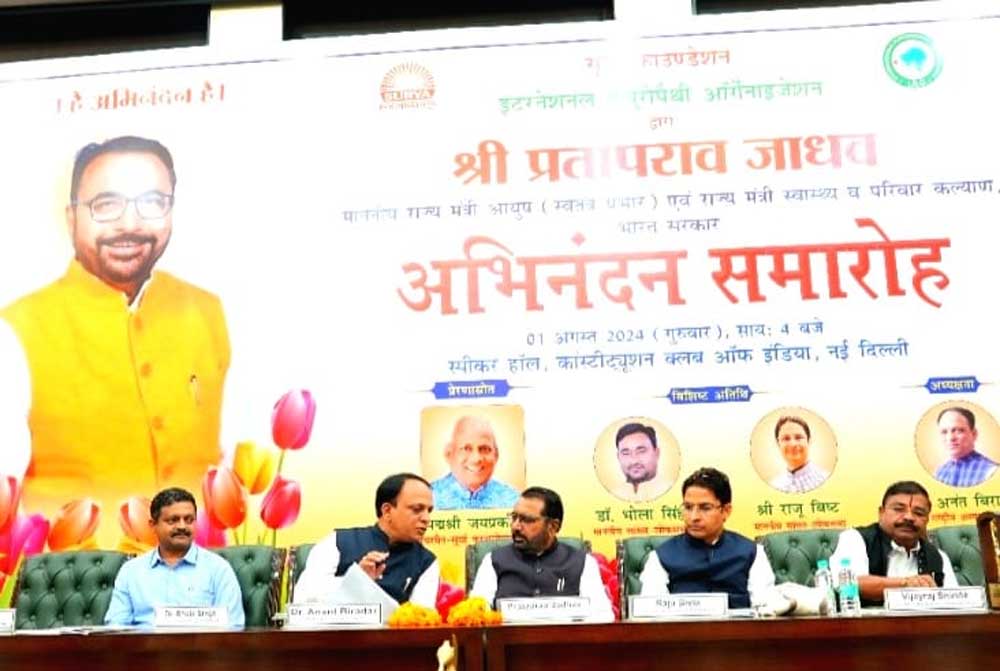 देश की राजधानी दिल्ली के कंस्टीट्यूशन क्लब ऑफ इंडिया में सूर्या फाउण्डेशन व इंटरनेशनल नेचुरोपैथी आर्गेनाइजेशन (INO) द्वारा केन्द्रीय आयुष राज्य मंत्री (स्वतंत्र प्रभार) श्री प्रतापराव जाधव का अभिनंदन समारोह आयोजित किया गया था। समारोह का उद्घाटन आयुष राज्य मंत्री (स्वतंत्र प्रभार) ने दीप प्रज्जवलन के साथ किया। समारोह में 200 से अधिक योग प्राकृतिक चिकित्सा जगत के प्रतिनिधियों के अतिरिक्त माननीय श्री राजू बिष्ट एवं श्री भोलासिंह जी दोनों सांसद, श्री कोस्तुभ कर्माकर (वेद जी) वॉइस चेयरमैन सूर्या फाउण्डेशन, डॉ. डी. एन. शर्मा व डॉ आर एस डबास दोनों राष्ट्रीय उपाध्यक्ष (INO) श्री बिजय राज शिन्दे पूर्व विद्यायक बुलढाना महाराष्ट्रा, श्री नन्द किशोर अग्रवाल अध्यक्ष व श्री मामराज अग्रवाल, बालाजी निरोगधाम वैलनेस नेचर क्योर दिल्ली तथा योग प्राकृतिक चिकित्सा योग की अन्य संस्थओं के प्रतिनिधि भी उपस्थित हुये।