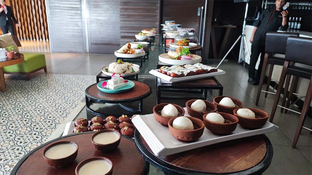 राज भोग, सोंदेश, कच्चा गुल्ला, पाईश, गोजा, रसगुल्ला, रसमलाई, लॉर्ड चाम, मिहिदाना, चना पाईश, बेक्ड रसगुल्ला, पंतुवा, दरबेश, अंगूरी रसमलाई और मिष्ठी दोई जैसे मीठे व्यंजनों के साथ आप अपने डिनर को समाप्त कर सकेंगे। इसके अतिरिक्त खट्टे मीठे और चटपटा खाने के शौकीनों के लिए लाइव काउंटर्स भी मौजूद रहेंगे जहाँ दही पापड़ी चाट, दही भल्ले, आलू घुगनी की चाट, फुचका और ढकाई चाट का आनंद लिया जा सकेगा।