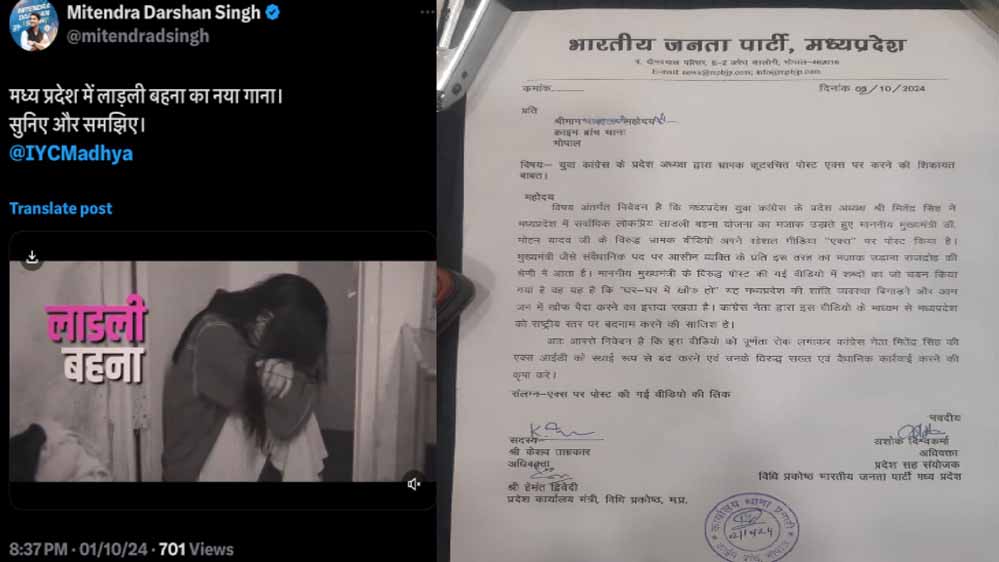 भाजपा के विधि प्रकोष्ठ की ओर से शिकायत देने के साथ यह मांग की गई है कि तुरंत मितेंद्र दर्शन सिंह का एक्स अकाउंट स्थाई रूप से बन कर दिया जाए। भाजपा ने कहा है कि इस तरह के वीडियो डालकर वह प्रदेश में शांति व्यवस्था बिगाड़ने का प्रयास कर रहे हैं। शिकायत में कहा गया है, 'मध्य प्रदेश युवा कांग्रेस के प्रदेश अध्यक्ष मितेंद्र सिंह ने लाडली बहना योजना का मजाक उड़ाने के साथ मुख्यमंत्री मोहन यादव के खिलाफ भ्रामक वीडियो एक्स पर पोस्ट किया।'