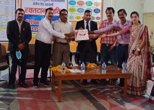 जिला न्यायालय विधिक सेवा प्राधिकरण सचिव मानवेंद्र पवार व जिला विधिक सेवा अधिकारी दिलीप मुजाल्दा ने रक्तदाताओं को प्रमाण पत्र वितरित किये। भोजमुक्त विश्व विद्यालय प्रचार-प्रसार सुनिधि शर्मा ने बताया कि रक्त कोष जिला चिकित्सालय बड़वानी मध्यप्रदेश द्वारा क्षेत्रीय निदेशक मध्यप्रदेश भोज मुक्त विश्वविद्यालय को रक्तदान शिविर के आयोजन के लिए प्रशंसा पत्र दिया गया। शिविर में प्रदेश कोषाध्यक्ष श्रीमती जया शर्मा और केंद्रीय जेल बड़वानी के उप जेल अधीक्षक विनय काबरा द्वारा प्रशंसा पत्र वितरित किए गये।