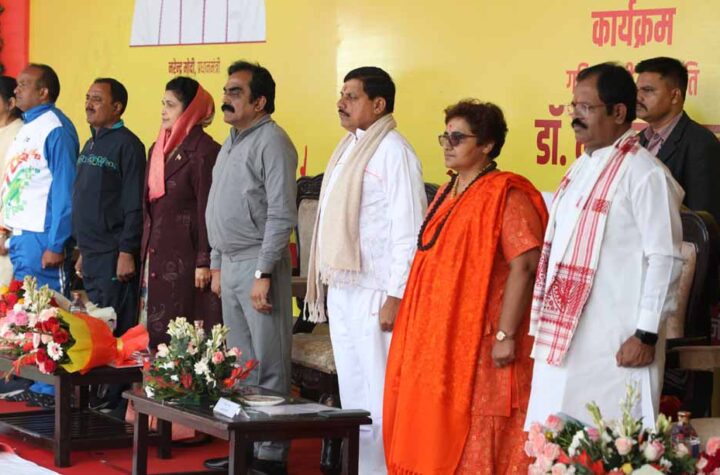 राज्य स्तरीय सूर्य नमस्कार कार्यक्रम में मुख्यमंत्री के साथ शामिल हुए मंत्री राकेश शुक्ला..... उमा भारती से आशीर्वाद लिया मंत्री...