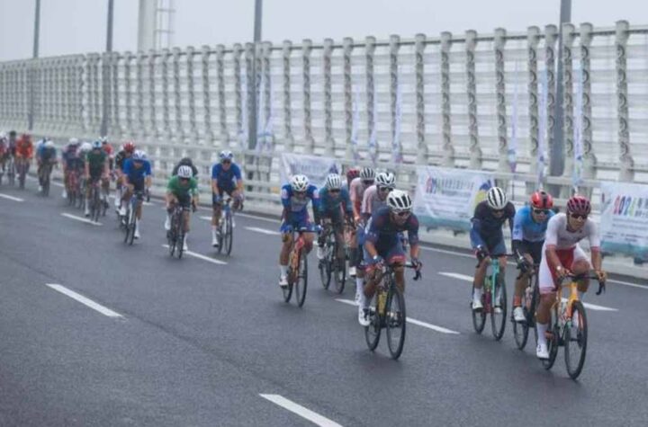 झुहाई. अगले वर्ष होने वाले 15वें चीनी राष्ट्रीय खेलों के लिए एक परीक्षण कार्यक्रम, 2024 ग्वांगडोंग-हांगकांग-मकाओ रोड साइकिलिंग रेस, रविवार...
