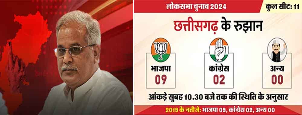 छत्तीसगढ़ लोकसभा की 10 सीटों पर भाजपा और एक पर कांग्रेस आगे, राजनांदगांव से भूपेश बघेल पिछड़े