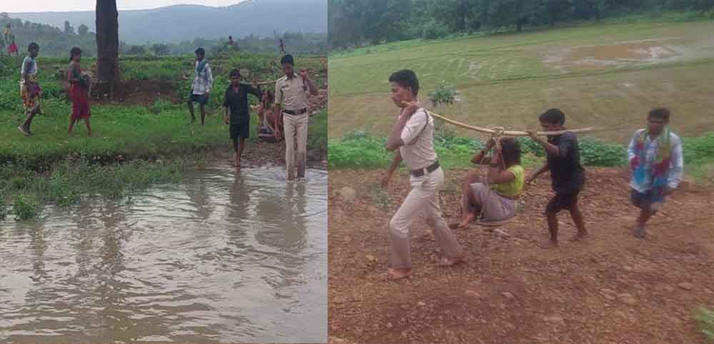 दरअसल यह कहानी कुछ इस तरह है रायगढ़ जिले में पहाड़ों के बीच बसा एक छोटा सा गांव पारेमेर घुटरूपारा है। यहां बरसात के दिनों में बरसाती नालों के कारण पहुंचना दुश्कर हो जाता है। इस गांव में एक महिला को प्रसव पीड़ा हुई। यह महिला दर्द से कराह रही थी। परिवार सदस्यों ने गर्भवती महिला सुष्मिता को अस्पताल ले जाने डायल 112 को मदद के लिए कॉल किया। मेडिकल इमरजेंसी का कॉल थाना कापू राईनो को प्राप्त हुआ। कालर ने महिला को प्रसव पीड़ा के दर्द होने की जानकारी दी। डायल 112 ड्यूटी में तैनात आरक्षक विपिन किशोर खलखो और ईआरवी वाहन चालक छोटू दास तुरंत रवाना हुए। गर्भवती महिला का घर नाला और पहाड़ी के उस पार स्थित होने तथा वाहन आवागमन के लिए रास्ता नहीं होने के बावजूद भी आरक्षक और वाहन चालक पैदल ही महिला के घर पहुंचे। गर्भवती महिला की स्थिति को देखकर बिना देरी किये संवेदनशीलता का परिचय दिया और आरक्षक ने कावड़ से प्रसव पीड़ित महिला को वाहन तक ले जाने घरवालों को राजी किया तथा स्वयं एक युवक के साथ कांवर में महिला को उठाकर डायल 112 वाहन तक ले गए।
