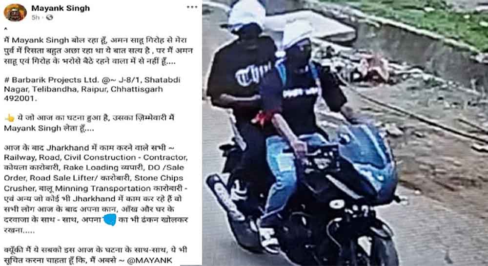 उसने धमकी भारी पोस्ट करते हुए कहा कि आज के बाद झारखंड में काम करने वाले सभी रेलवे, रोड, सिविल कंस्ट्रक्शन, कांट्रैक्टर, कोयला कारोबारी, रैक लोडिंग व्यापारी, डू सेल ऑर्डर, रोड सेल लिफ्टर करबारी, स्टोन चिप्स क्रेशर, बालू मीनिंग, ट्रांसपोर्टेशन कारोबारी और अन्य जो कोई भी झारखंड में काम कर रहे हैं वह सभी लोग आज के बाद अपना कान आंख और घर के दरवाजा खोलकर रखना… उसने आगे लिखा कि क्योंकि मैं यह सब को इस आज के घटना के साथ-साथ ये भी सूचित करना चाहता हूं कि मैं अब से~@MAYANK