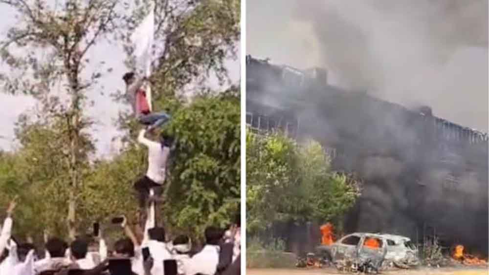 आंदोलन करने पहुंचे उपद्रवियों ने बैरिकेड तोड़ने के बाद कलेक्ट्रेट परिसर के अंदर घुसकर पहले तोड़फोड़ की। उसके बाद परिसर में खड़ी गाड़ियों पर पेट्रोल डालकर आग लगा दी। हजारों की संख्या में कलेक्ट्रेट परिसर के अंदर घुसे लोगों ने पुलिस कर्मियों पर पत्थर और डंडे फेंकना शुरू कर दिए। इस बीच एक वीडियो सोशल मीडिया में सामने आया जिसमें उपद्रवियों के द्वारा इस आगजनी की घटना को अंजाम देने के बाद सामाजिक झंडा फहराया गया।