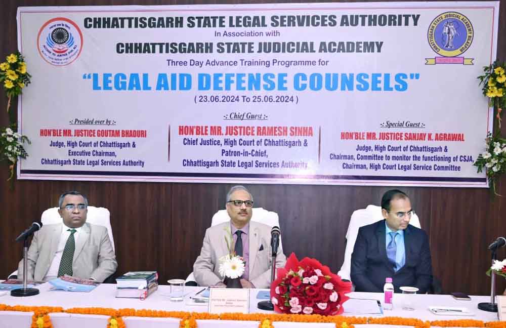प्रशिक्षण कार्यक्रम में छत्तीसगढ़ उच्च न्यायालय के न्यायाधीश एवं छत्तीसगढ़ राज्य विधिक सेवा प्राधिकरण के कार्यपालक अध्यक्ष न्यायमूर्ति श्री गौतम भादुड़ी ने कौंसिलों से कहा कि नालसा एवं सालसा का मुख्य उद्देश्य निर्दाेष एवं जरूरतमंदों की सुरक्षा सुनिश्चित करना है। इस हेतु डिफेंस कौंसिल सिस्टम में नियुक्त सभी कौंसिल अपने कार्य को नियोजन न मानकर सेवा कार्य के रूप में जिम्मेदारी से निर्वहन करें।