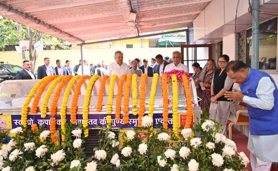 मुख्यमंत्री श्री विष्णु देव साय राजधानी रायपुर स्थित पाटन सदन पहुंचे। उन्होंने पाटन सदन में पूर्व मुख्यमंत्री श्री भूपेश बघेल के पिता स्वर्गीय श्री नंदकुमार बघेल के पार्थिव शरीर पर पुष्प अर्पित कर उन्हें श्रद्धांजलि अर्पित की।