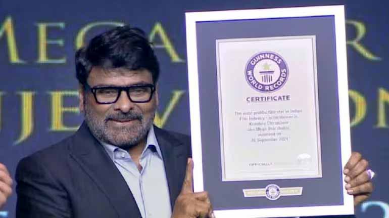 दक्षिण भारतीय फिल्मों के सुपरस्टार चिरंजीवी को गिनीज वर्ल्ड रिकॉर्ड से सम्मानित किया गया। चिरंजीवी अब गिनीज वर्ल्ड रिकॉर्ड्स के धारक बन गए हैं। चिरंजीवी को यह सम्मान 45 वर्षों में अपनी 156 फिल्मों के 537 गानों में 24000 डांस मूव्स करने के लिए मिला। इसी दिन सुपरस्टार चिरंजीवी 1978 में भारतीय फिल्म इंडस्ट्री में अपने फिल्मी करियर की शुरुआत की थी। चिरंजीवी को यह सम्मान आमिर खान ने दिया।