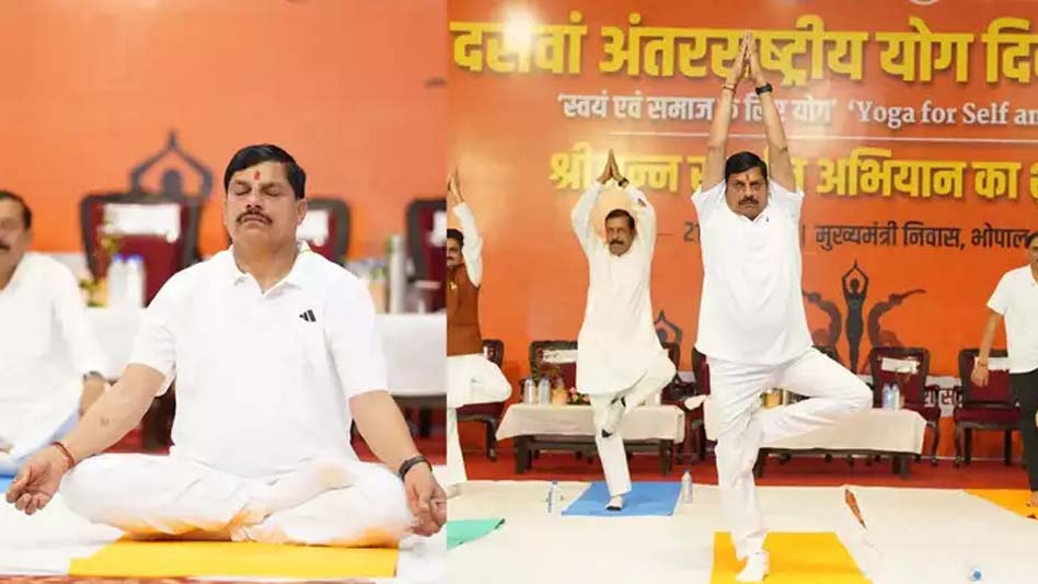 मुख्यमंत्री डॉक्टर मोहन यादव ने दसवें अंतर्राष्ट्रीय योग दिवस के मौके पर बारिश के कारण मुख्यमंत्री निवास में ही आयोजित कार्यक्रम में भाग लिया। यहां उन्होंने सिंगल क्लिक द्वारा श्री अन्न संवर्धन अभियान का शुभारंभ किया। उनके साथ सीएम हाउस पर 10वें अंतरराष्ट्रीय योग दिवस के कार्यक्रम में भोपाल के सांसद आलोक शर्मा, महापौर मालती राय सहित कई दिग्गज नेता सम्मलित हुए। यहां सैकड़ों की संख्या में विद्यार्थियों ने भी योगाभ्यास किया।