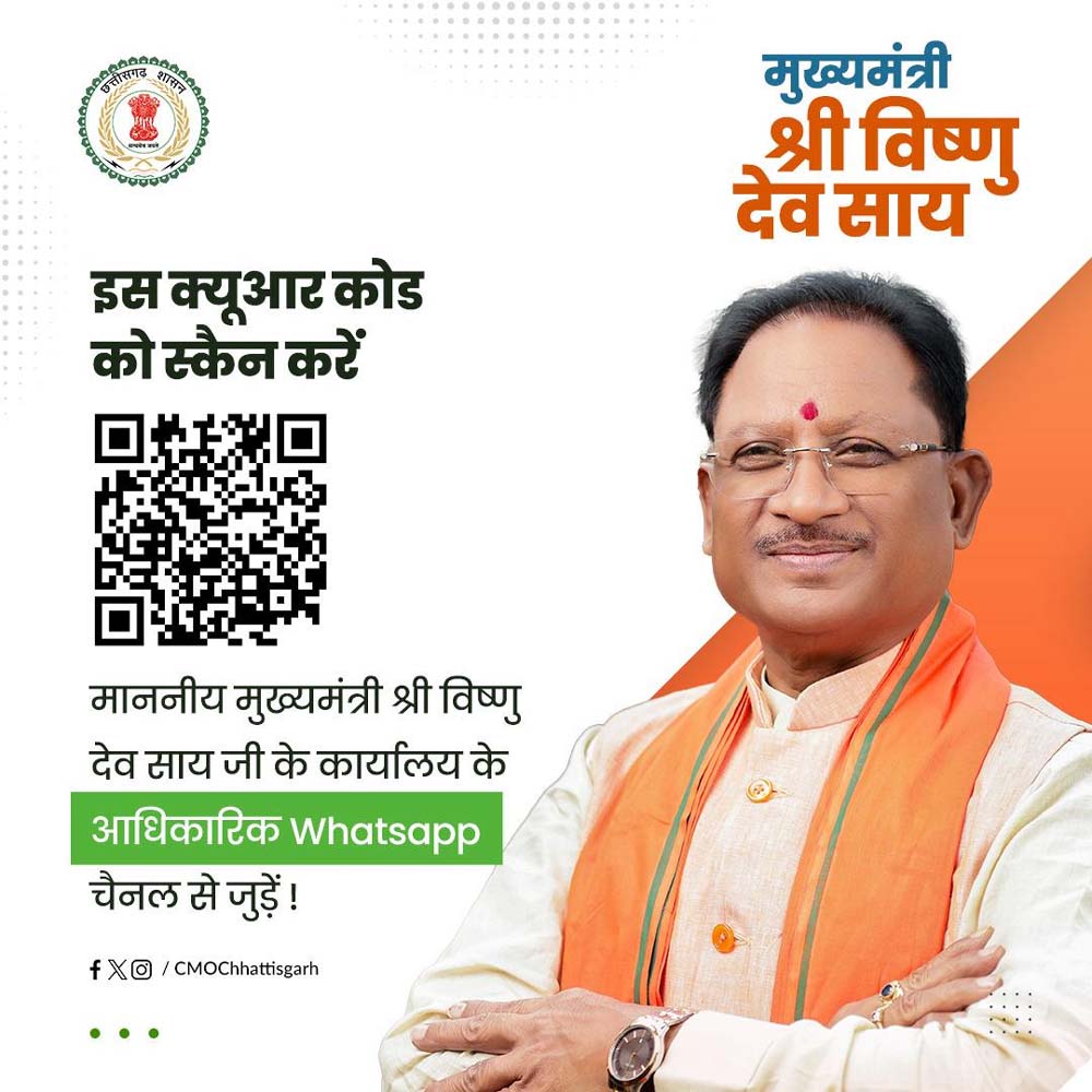 ''मुख्यमंत्री विष्णु देव साय के लिए छत्तीसगढ़ की  जनता 'एक परिवार' है और मुख्यमंत्री के साथ संचार के सरल माध्यम वॉट्सएप के जरिए 'छत्तीसगढ़ परिवार' के हर सदस्य से आसानी संवाद करने के लिए राज्य सरकार ने सीजी संवाद नाम से एक आधिकारिक व्हाट्सएप चैनल शुरू किया है।”