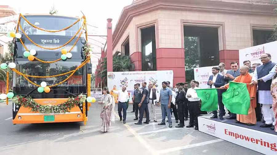 सीएम योगी ने डबल डेकर इलेक्ट्रिक बस को दिखाई हरी झंडी