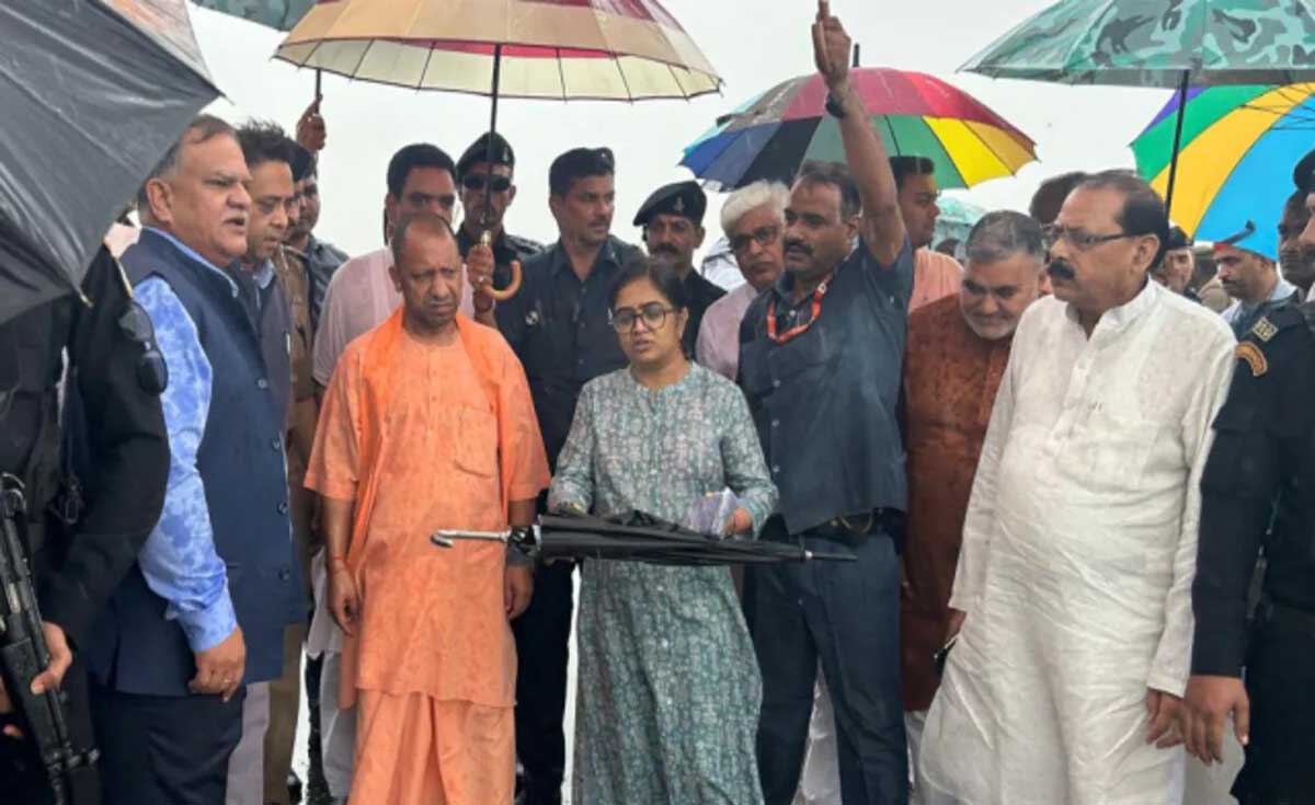 बरसते पानी के बीच घटनास्थल पहुंचे सीएम योगी