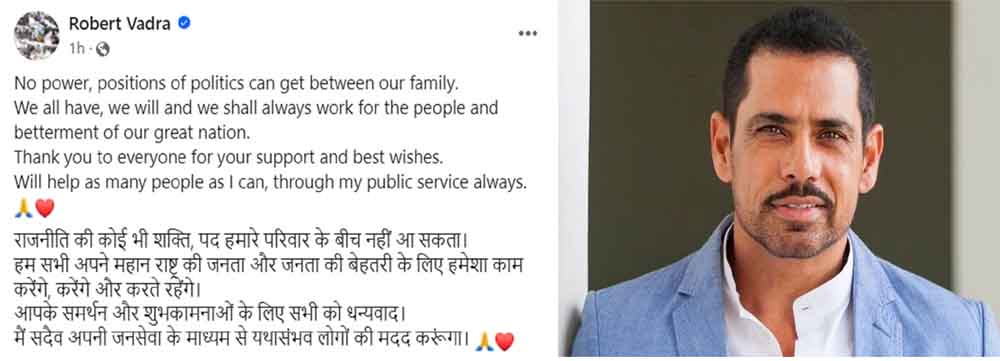 फेसबुक पर किए गए पोस्ट में रॉबर्ट वाड्रा ने लिखा, 'राजनीति की कोई भी शक्ति, पद हमारे परिवार के बीच नहीं आ सकती। हम सभी अपने महान राष्ट्र की जनता और जनता की बेहतरी के लिए हमेशा काम करेंगे, करेंगे और करते रहेंगे। आपके समर्थन और शुभकामनाओं के लिए सभी को धन्यवाद। मैं सदैव अपनी जनसेवा के माध्यम से यथासंभव लोगों की मदद करूंगा।'