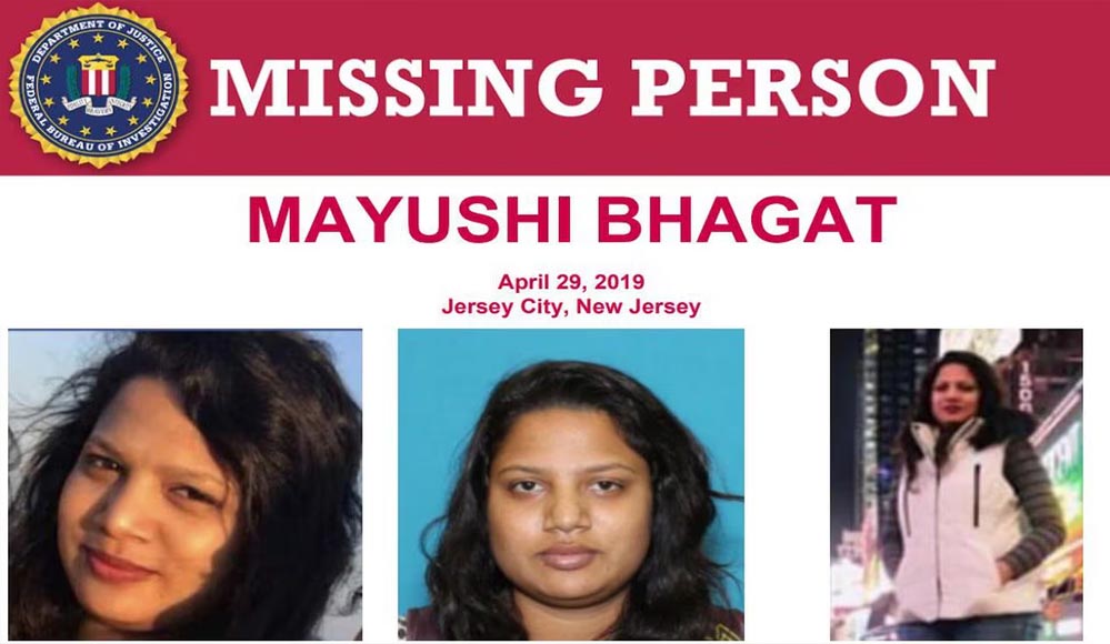मयूशी भगत को आखिरी बार 29 अप्रैल, 2019 की शाम को जर्सी सिटी में अपने अपार्टमेंट से निकलते हुए देखा गया था। मयूशी के परिवार ने एक मई, 2019 को पुलिस को उसके लापता होने की सूचना दी थी।