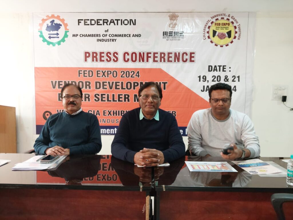 फेडरेशन ऑफ़ एमपी चैंबर्स ऑफ़ कॉमर्स एंड इंडस्ट्री एवं सूक्ष्म, लघु एवं मध्यम उद्यम मंत्रालय के तत्वाधान से तीन दिवसीय ‘फेड एक्सपो 2024’ का आयोजन किया जा रहा है। इस दौरान वेंडर डेवलपमेंट एवं बायर सेलर मीट भी होगी। राजधानी भोपाल के गोविंदपुरा स्थित जीआईए एग्जिबिशन सेंटर में 19, 20 और 21 जनवरी को यह एक्सपो आयोजित होगा। एक्सपो के लिए भूमि पूजन मकर संक्रांति के मौके पर होगा। यह जानकारी बुधवार को फेडरेशन ऑफ़ मध्यप्रदेश चैंबर ऑफ़ कॉमर्स एंड इंडस्ट्री की ओर से आयोजित प्रेस वार्ता में दी गई।
