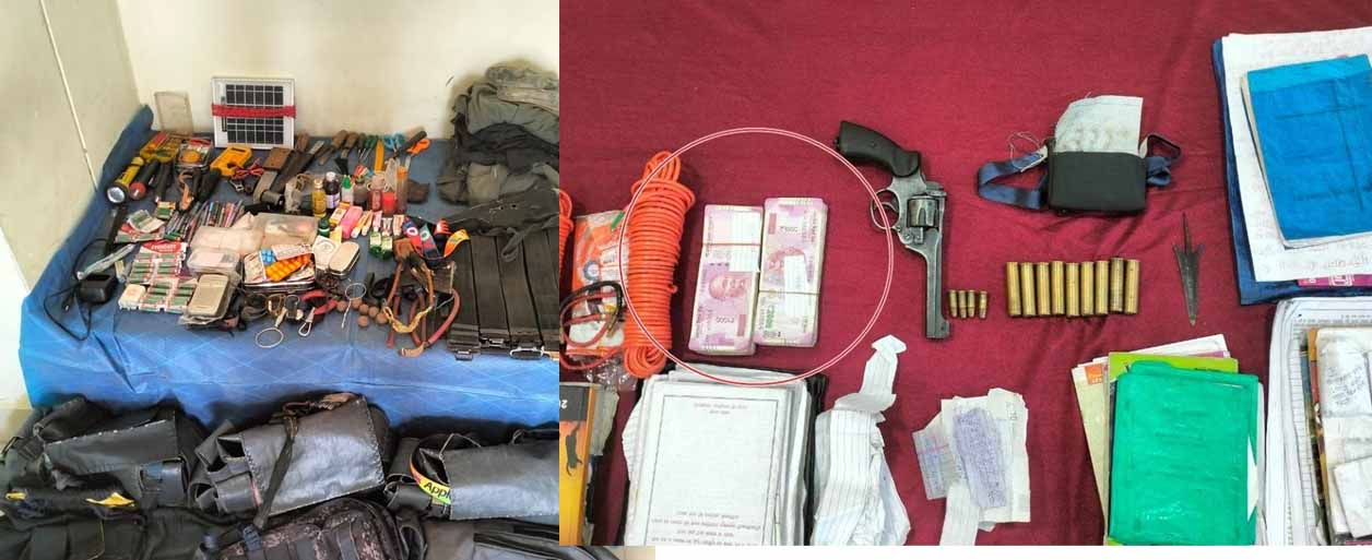 जवानों ने कैंप से एक पिस्तौल, नकद चार लाख रुपये के अलावा चार नग रिवाल्वर राउंड, नौ खाली खोखे, एक रेडियो, एक मल्टीमीटर, 30 छोटी बैटरी, एक मोबाइल चार्जर, चार टार्च, चार जोड़ी नक्सली यूनिफार्म, दस्तावेज, दो टोपी, पांच बेल्ट, तीन जोड़ी जूते, आठ चाकू, एक तीर, एक धनुष, दो स्क्रूड्राइवर, पांच बंडल रस्सी, सात बैग, एक सोलर प्लेट, तीन घड़ी, गुलेल, तीन पानी ड्रम, बाटल, प्लेट, चम्मच आदि बरामद किया है। साथ ही दवाइयां और राशन सामग्री भी जब्त की गई है।