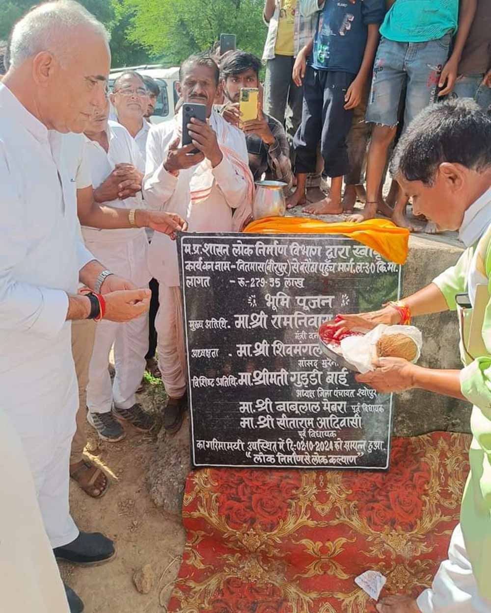 वन एवं पर्यावरण मंत्री श्री रामनिवास रावत ने विजयपुर विकासखण्ड क्षेत्र में 9 करोड़ 60 लाख 89 हजार रुपये लागत से बनने वाली 4 सड़कों का भूमि-पूजन किया। इनमें नितनवास से बरोठा लागत 2 करोड़ 79 लाख लम्बाई 3 किलोमीटर, दूबावली से रिझेठा व्हाया कुम्हारपुरा लागत 2 करोड़ 83 लाख लम्बाई 3 किलोमीटर, ग्राम नीमच से अर्रोदरी लागत 2 करोड़ 85 लाख लम्बाई 3 किलोमीटर और दूबावली-जमूदी रोड से माता मंदिर तक लागत एक करोड़ 12 लाख लम्बाई एक किलोमीटर शामिल हैं।