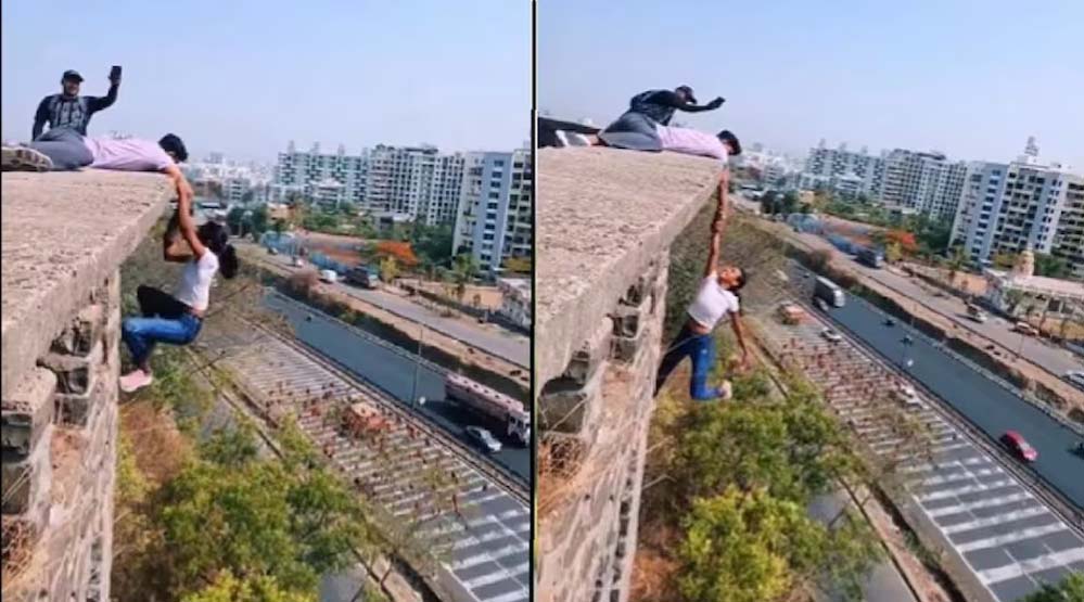 बिल्डिंग की छत पर एक युवक लेट गया और उसका हाथ पकड़कर लड़की बिल्डिंग से लटकने लगी. इस दौरान एक अन्य युवक वीडियो बना रहा था. वहीं कुछ लोग बिल्डिंग के नीचे से वीडियो बना रहे थे. वीडियो बनाने को लेकर लड़की ने खुद की जिंदगी को खतरे में डाला.