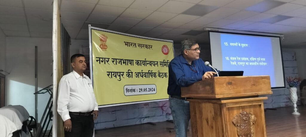 नगर राजभाषा कार्यान्वयन समितिकी वर्ष 2024 की प्रथम छमाही बैठक रेल अधिकारी क्लब, उल्लास में समिति के अध्यक्ष व मंडल रेल प्रबंधक श्री संजीव कुमार की अध्यक्षता में बुधवार को आयोजित की गई। मुख्य अतिथि एवं विशिष्ट अतिथियों द्वारा दीप प्रज्वलन कर कार्यक्रम का शुभारंभ हुआ। तत्पश्चात अपर मंडल रेल प्रबंधक (इन्फ्रा.) एवं उपाध्यक्ष, नगर राजभाषा कार्यान्वयन समिति, रायपुर द्वारा मुख्य अतिथि एवं विशिष्ट अतिथियों का पुस्तकें भेंट कर स्वागत किया गया। इस अवसर पर मंडल रेल प्रबंधक एवं अध्यक्ष, नगर राजभाषा कार्यान्वयन समिति, रायपुर श्री संजीव कुमार के  द्वारा नगर राजभाषा कार्यान्वयन समिति, रायपुर द्वारा प्रकाशित हिंदी पत्रिका ‘मुक्तांगन’ के प्रवेशांक का विमोचन किया गया।