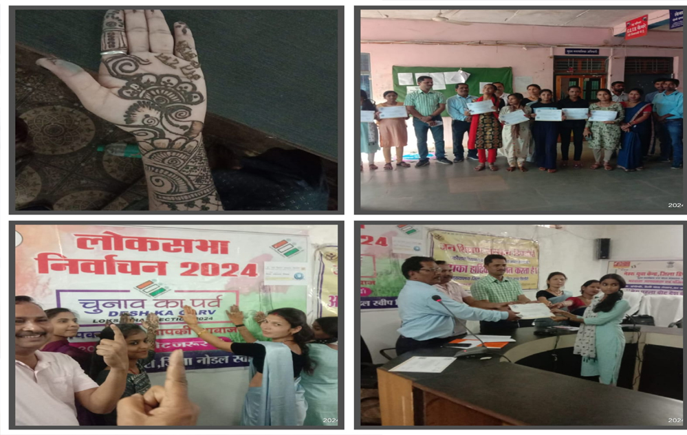 कार्यक्रम का संचालन चंदन चौहान ने किया इस अवसर पर संस्थान के प्रशिक्षक विवेक साहू श्रीमती शोभना उसराठे श्रीमती विनीता मरावी अपने लाभार्थियों के साथ उपस्थिति रही l लाभार्थियों मैं रंगोली एवं मेहंदी प्रतियोगिता में उत्साहपूर्वक भाग लेकर विश्व स्वास्थ्य दिवस एवं मतदाता जागरूकता के महत्व को प्रकाशित किया अंत में लाभार्थियों को प्रशिक्षण का प्रमाण पत्र वितरित किया गया l