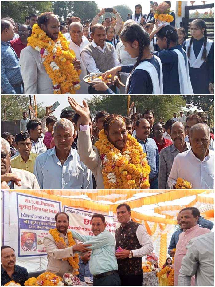 मंच पर मुख्य अतिथि के रूप में पूर्व मंडल प्रबंधक मध्य प्रदेश राज्य विपणन संघ महेश चंद्र त्रिवेदी, बी.एम चौरसिया वि.शि.अ.नालछा, गुलवा हां.से.स्कुल पुर्व प्राचार्या श्रीमती इंदू गेद, प्राचार्य बोधवाड़ा स्कूल अखिलेश चौरे, विष्णु कुमारिया प्राचार्य मेघापूरा स्कूल, गुलवा प्राचार्य ओमेंद्रसिंह चौहान जनपद सदस्य लोकेंद्र चौधरी, सरपंच शुभम ठाकुर, शुभम चौधरी उपसरपंच विराजमान थे। विद्यालय परिवार की ओर से सामूहिक रूप से त्रिवेदी सर का स्वागत किया गया। कार्यक्रम का संचालन शिक्षक संतोष कुमार वर्मा ने किया एवं आभार प्रकट शिक्षक रितेश चौधरी द्वारा किया गया सामूहिक राष्ट्रगान एवं भोज के साथ में कार्यक्रम का समापन हुआ।