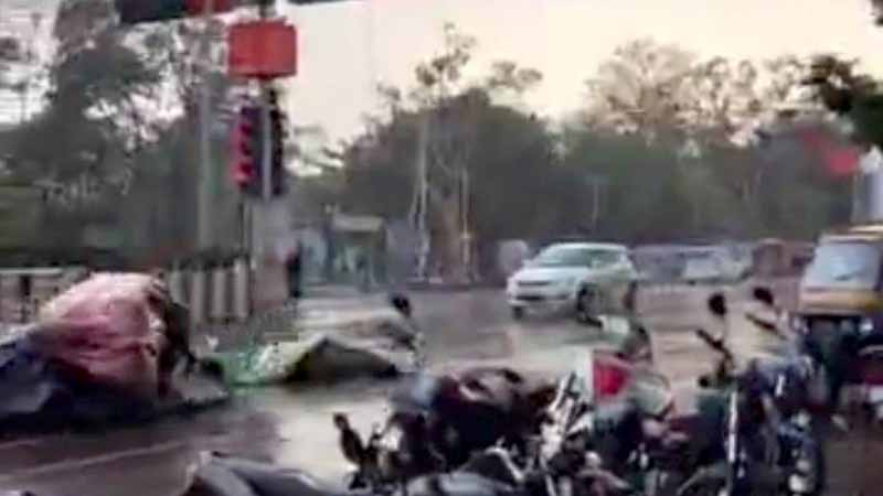 बुधवार शाम दुर्ग-भिलाई में तेज अंधड़ चलने के साथ बारिश भी हो रही थी। शाम करीब छह बजे के आसपास राजेंद्र पार्क चौक दुर्ग के निकट होर्डिंग्स में लगा फ्लैक्स अंधड़ की वजह से उड़ कर गिर गया। यह होर्डिंग दुर्ग से भिलाई की तरफ जा रहे स्कूटी सवार एक युवक के ऊपर गिरा। इसके गिरते ही युवक भी स्कूटी सहित सड़क के बीचों बीच गिर गया। इस व्यस्तम मार्ग में सुबह से लेकर देर रात तक वाहनों का आवागमन लगा रहता है। लेकिन अंधड़ व बारिश के दौरान वाहनों की आवाजाही कम रही। इस वजह से बड़ा हादसा टल गया।