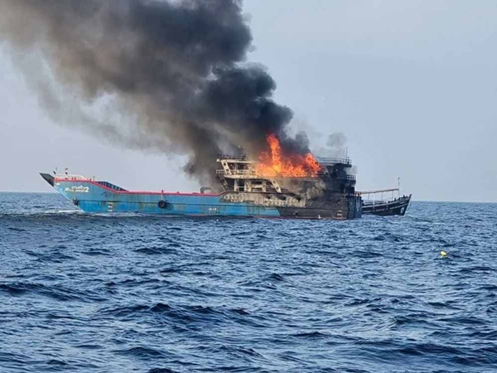 थाईलैंड की खाड़ी में जहाज में लगी भीषण आग, बचने के लिए समुद्र में कूदे लोग