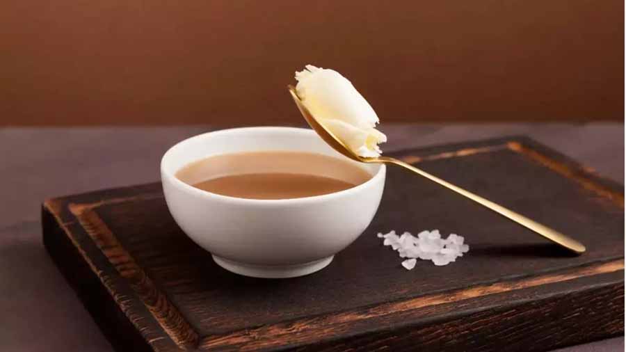 बस तैयार है आपकी मक्खन वाली चाय, इसे गर्मागर्म सर्व करें।