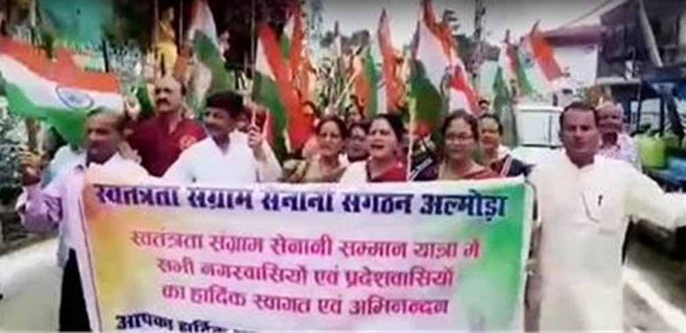 उत्तराखंड के अल्मोड़ा में स्वतंत्रता सेनानी एवं उत्तराधिकारी संगठन ने अगस्त क्रांति की वर्षगांठ पर स्वतंत्रता सेनानी सम्मान यात्रा निकाली। यह तिरंगा यात्रा माल रोड में स्थित जीबी पंत पार्क से लेकर चौघानपाटा गांधी पार्क तक निकाली गई। इस यात्रा के दौरान शहीदों व स्वतंत्रता सेनानियों को याद करते हुए नमन किया गया। इसमें अल्मोड़ा विधायक मनोज तिवारी व निवर्तमान पालिका अध्यक्ष प्रकाश जोशी भी मौजूद रहे।