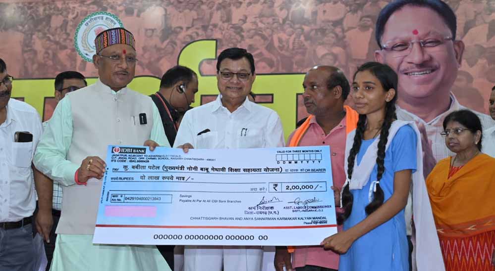 मुख्यमंत्री साय ने 10वीं और 12वीं की बोर्ड परीक्षा में टॉप 10 में स्थान अर्जित करने वाले पंजीकृत श्रमिकों के 13 मेधावी बच्चों को नोनी-बाबू मेधावी शिक्षा सहायता योजना के दो-दो लाख रुपए की सहायता राशि का चेक वितरित प्रदान किए। कार्यक्रम के प्रारंभ में मुख्यमंत्री श्री साय ने स्वामी विवेकानंद जी की पुण्यतिथि पर उनके चित्र पर पुष्प अर्पित कर उन्हें श्रद्धांजलि अर्पित की। मेधावी बच्चों को प्रदान किए गए दो-दो लाख रूपए की राशि में एक लाख रुपए प्रोत्साहन स्वरूप और एक लाख रूपए स्कूटी खरीदने के लिए दिए गए।