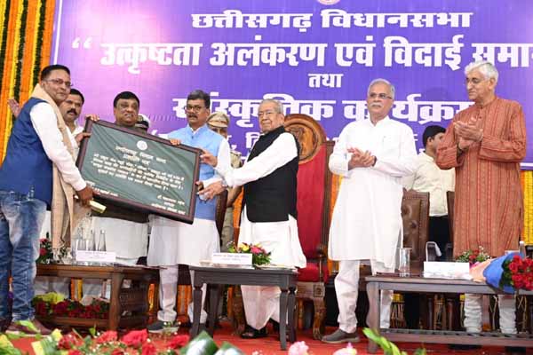 राज्यपाल श्री विश्वभूषण हरिचंदन आज छत्तीसगढ़ विधानसभा द्वारा आयोजित उत्कृष्टता अलंकरण समारोह और पंचम विधानसभा के विधायकों के लिए आयोजित बिदाई समारोह में मुख्य अतिथि बतौर शामिल हुए। इस अवसर पर राज्यपाल ने कहा कि छत्तीसगढ़ विधानसभा में उत्कृष्ट विधायकों एवं उत्कृष्ट संसदीय पत्रकारों को सम्मानित करने की यह परंपरा अत्यंत सराहनीय है।