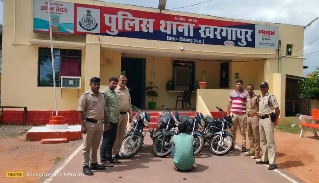 खरगापुर पुलिस ने शातिर मोटरसाइकिल चोर को गिरफ्तार किया है। आरोपी से करीब ढाई लाख रुपए कीमत की चार चोरी की गयी बाइक भी जब्त की गयी है। पुलिस अधीक्षक टीकमगढ रोहित काशवानी द्वारा संम्पत्ति संबंधी अपराधो बरामदगी एवं आरोपीयो की गिरफ्तारी हेतु निर्देशित किया गया है। इसी तारतम्य में अतिरिक्त पुलिस अधीक्षक टीकमगढ सीताराम एवं एस.डी.ओ.पी. टीकमगढ राहुल कटरे के मार्गदर्शन में थाना प्रभारी खरगापुर मनोज द्विवेदी द्वारा कार्यवाही करते हुए।