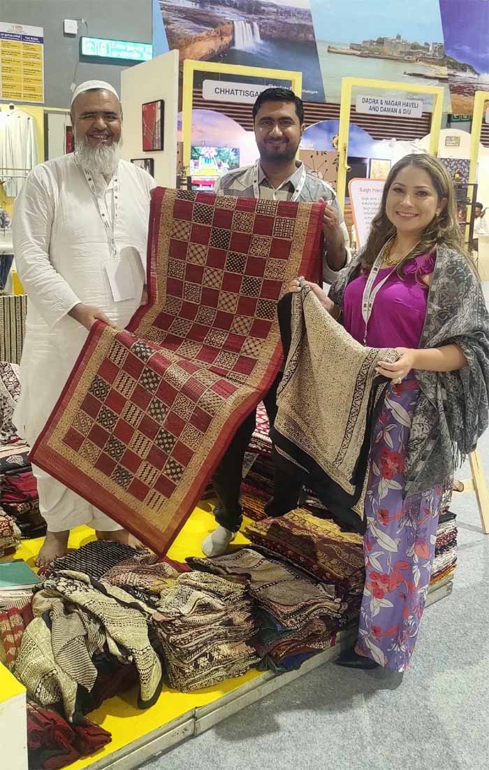 नई दिल्ली में विश्व धरोहर समिति के भारत मंडपम में आयोजित 46वें सत्र में मध्यप्रदेश के शिल्पगुरू श्री मोहम्मद यूसुफ खत्री और राष्ट्रीय पुरस्कार विजेता श्री मोहम्मद बिलाल खत्री विख्यात बाघ प्रिंट हस्तकला का सजीव प्रदर्शन कर रहे हैं। विदेशी प्रतिनिधियों और अन्य आगंतुकों को वे बाघ प्रिंट की बारीकियां समझा रहे हैं। सत्र में विदेशी प्रतिनिधि अपने हाथों से बाघ ठप्पा छपाई का अनुभव कर रहे हैं और छपाई के सैंपल को अपने साथ अपने देश लेकर जा रहे हैं। सत्र के सभी प्रतिभागियों को बाघ प्रिंट के परिधान बहुत लुभा रहे हैं और वे बाघ प्रिंट विरासत को संजोने में श्री युसूफ खत्री और श्री बिलाल खत्री के योगदान की प्रशंसा कर रहे हैं।