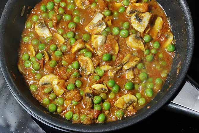 मशरूम पानी छोड़ देंगे इसलिए उसी हिसाब से डालें। यदि मटर या मशरूम पकने के बाद भी बहुत अधिक पानी है, तो मटर मशरूम करी को ढक्कन के बिना कुछ और मिनटों तक उबालकर पानी कम कर दें जब तक आपको सही स्थिरता न मिल जाए।