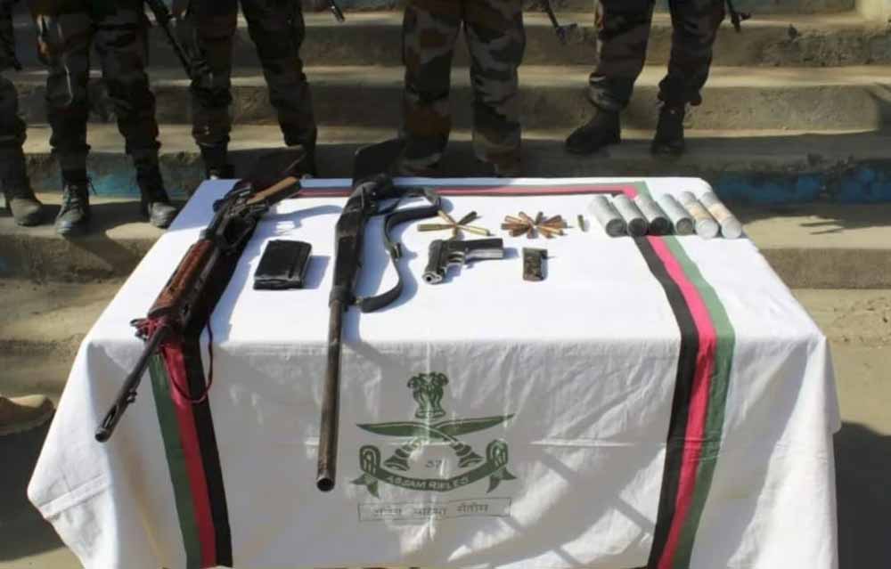 चुराचांदपुर जिले के फेखोथांग गांव में छापेमारी के दौरान एक एसएलआर राइफल, एक मैगजीन, नौ एमएम एक पिस्तौल, 12 बोर की सिंगल बैरल बंदूक और 15 कारतूस बरामद किए गए।