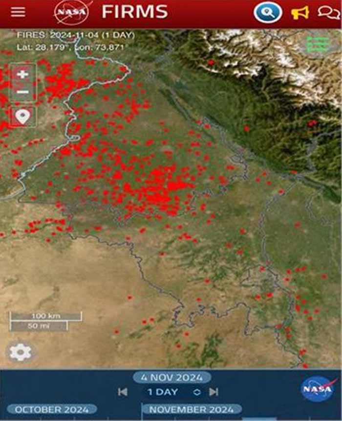 हरियाणा सरकार की ओर से पिछले कुछ वर्षों में किसानों के लिए पराली प्रबंधन को लेकर कई योजनाएं और जागरूकता अभियान चलाए गए हैं। नासा की आधिकारिक वेबसाइट पर 4 और 5 नवंबर के एक्टिव फायर डेटा की तस्वीरों ने हरियाणा के पराली प्रबंधन की एक सकारात्मक तस्वीर पेश की है। इस बार भी हरियाणा में पराली जलाने के मामले पड़ोसी राज्यों के मुकाबले लगभग दो-तिहाई कम दर्ज किए गए हैं। नासा की इन तस्वीरों में हरियाणा में पराली जलाने के बेहद कम केस स्पष्ट रूप से देखे जा सकते हैं।