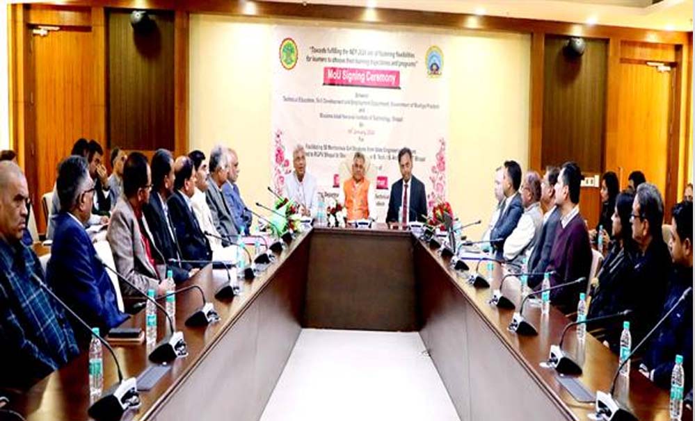 प्रदेश के इंजीनियरिंग महाविद्यालयों में अध्ययनरत बीई/बीटेक/बीआर्क पाठ्यक्रमों की मेधावी 50 छात्राओं का अंतिम वर्ष का अध्ययन मौलाना आजाद नेशनल इंस्टीट्यूट ऑफ टेक्नोलॉजी (मैनिट) भोपाल से कराये जाने के संबंध में आज तकनीकी शिक्षा,उच्च शिक्षा एवं आयुष मंत्री इन्दर सिंह परमार की उपस्थिति में मंत्रालय के सभा कक्ष में तकनीकी शिक्षा, कौशल एवं रोजगार विभाग के अपर मुख्य सचिव मनु श्रीवास्तव एवं मैनिट, भोपाल के निदेशक करुणेश कुमार शुक्ल के मध्य समझौता ज्ञापन (एमओयू) निष्पादित किया गया। इस अवसर पर आरजीपीवी विश्विद्यालय के कुलपति डॉ सुनील गुप्ता सहित विभागीय अधिकारीगण एवं लाभान्वित छात्राएं उपस्थित थीं।
