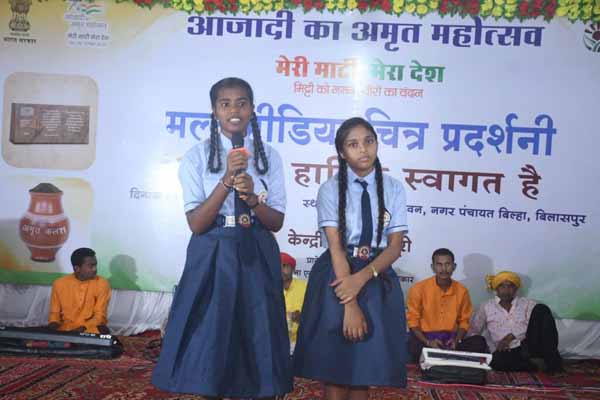 भारत सरकार, सूचना एवं प्रसारण मंत्रालय के केंद्रीय संचार ब्यूरो (सीबीसी) रायपुर द्वारा बिल्हा के सांस्कृतिक भवन में आयोजित आजादी का अमृत महोत्सव मेरी माटी मेरा देश पर केंद्रित त्रिदिवसीय मल्टीमीडिया चित्र प्रदर्शनी में 15 अगस्त के अवसर पर विविध प्रकार की जागरूकता प्रतियोगिता का आयोजन किया गया।