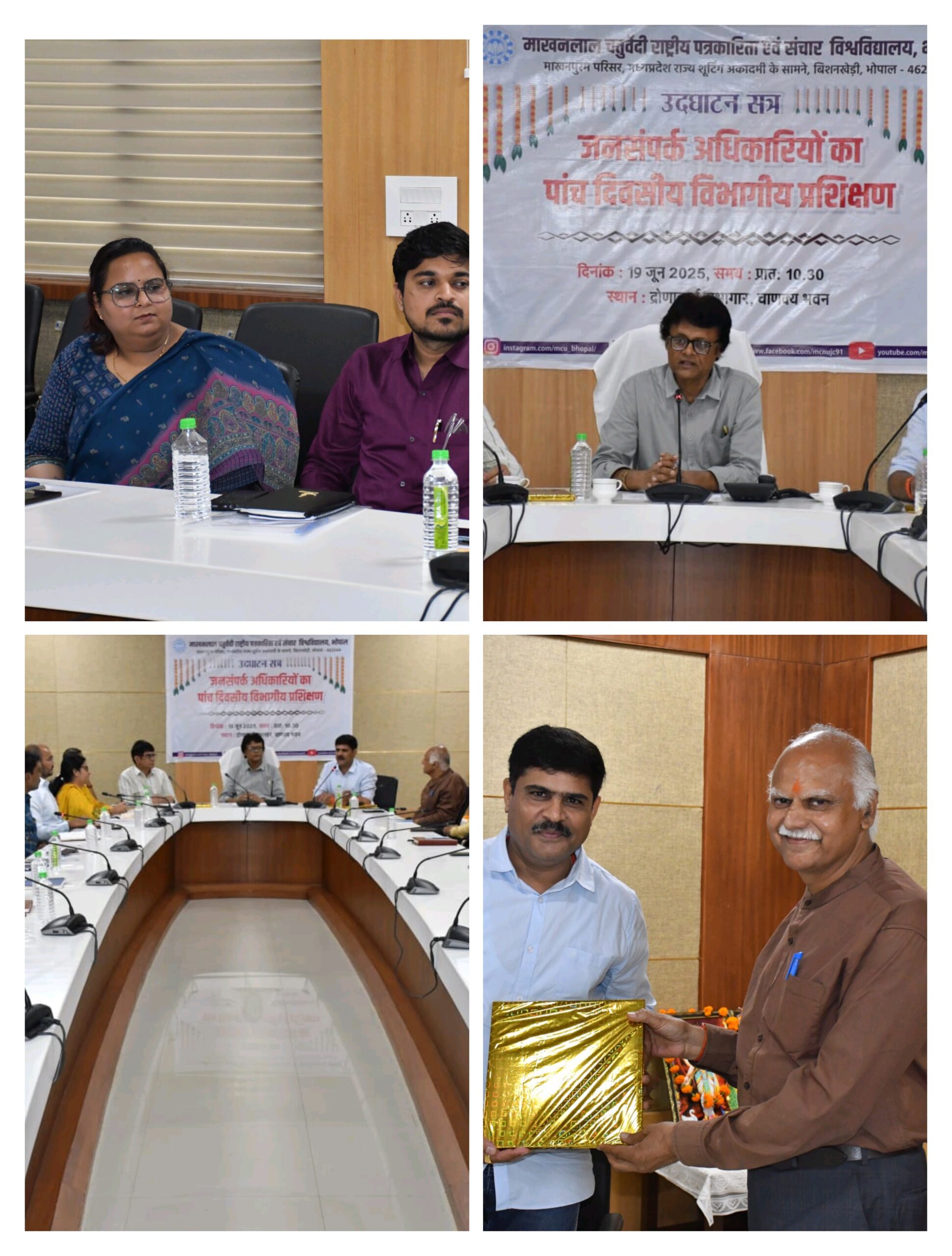 माखनलाल चतुर्वेदी राष्ट्रीय पत्रकारिता एवं संचार विश्वविद्यालय में मध्यप्रदेश जनसंपर्क विभाग के नवीन सहायक जनसंपर्क अधिकारियों के लिए पांच दिवसीय प्रशिक्षण कार्यशाला का शुभारंभ गुरुवार को विश्वविद्यालय के कुलगुरु विजय मनोहर तिवारी, अपर संचालक गुरमीत सिंह वाधवा, उप संचालक अवनीश सोमकुंवर , ऋषभ जैन ने किया। इस अवसर पर कुलगुरु श्री तिवारी ने कहा कि जनसंपर्क अधिकारियों में जन शब्द लगा है इसीलिए उन्हें जन का विशेष ध्यान रखना चाहिए । उन्होंने कहा कि पी आर ओ को लिखते समय अपने भीतर के पत्रकार को मरने नहीं देना चाहिए, उसे हमेशा जगाए रखना चाहिए। श्री तिवारी ने कहा कि पीआरओ सीधे जनता से जुड़ेंगे तो जनता को अच्छा लगेगा। अच्छा लिखने की बात करते हुए उन्होंने कहा कि अच्छा लिखने का सामर्थ अच्छा पढ़ने से आता है इसलिए आपको खूब पढ़ना चाहिए ताकि अच्छा लिख सको । श्री तिवारी ने कहा कि अगले 25 साल अतिमहत्वपूर्ण हैं । 2047 में जब आजादी के 100 साल पूरे होंगे तो इसमें आपका भी योगदान और भूमिका बहुत बड़ी होगी। कुलगुरु ने कहा कि जनसंपर्क अधिकारियों को अच्छी मंशा एवं नियत के साथ कार्य करना चाहिए । गांव में बहुत अच्छे अच्छे कार्य करने वाले,नवाचार करने वाले लोगों से, सरपंचों से मिलना चाहिए और उनकी कहानियों को लेखन के माध्यम से लोगों तक पहुंचाना चाहिए। शिक्षा, स्वास्थ्य, कृषि,उद्यान,इंफ्रास्ट्रक्चर आदि जनता से सीधे जुड़े विषय पर लेखन करने की बात करते हुए कुलगुरु ने कहा कि आप जिस भी जिले में जाएं उसके इतिहास, वहां की खूबियों के बारे में अवश्य जानकारी रखें।