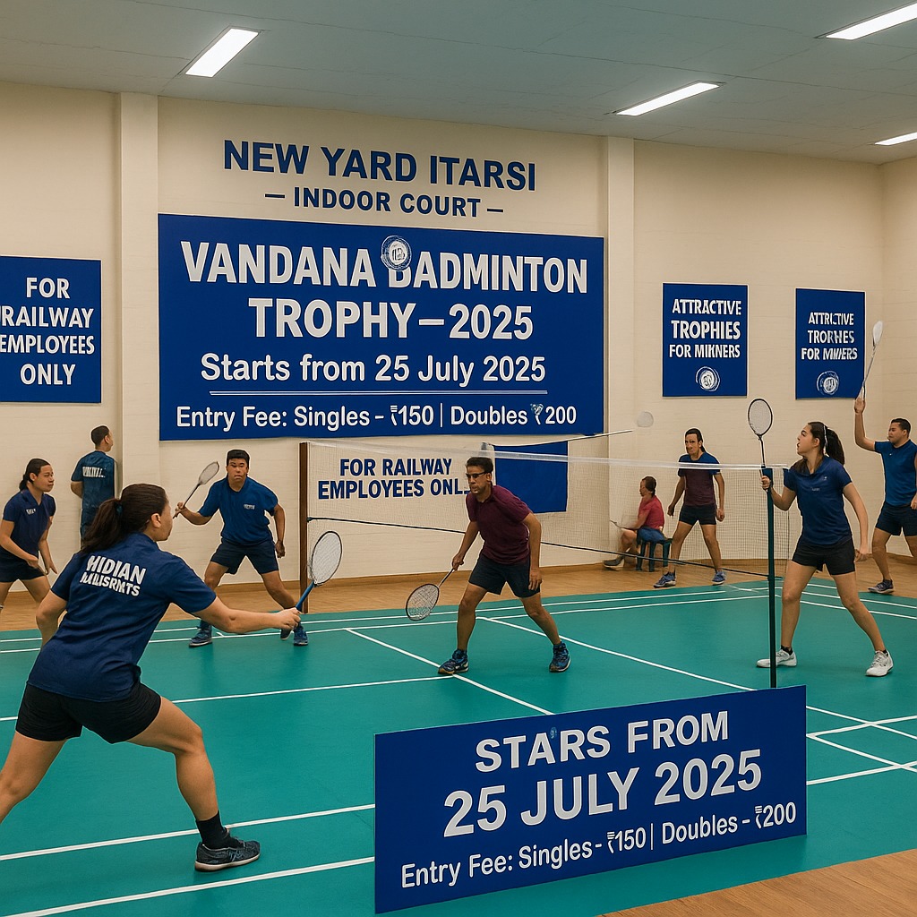भोपाल मंडल के न्यू यार्ड इटारसी स्थित वंदना कम्यूनिटी हॉल में रेलवे कर्मचारियों और सेवानिवृत्त कर्मचारियों के लिए बैडमिंटन टूर्नामेंट “वंदना बैडमिंटन ट्रॉफी – 2025” का आयोजन किया जा रहा है। यह प्रतियोगिता 25 जुलाई 2025 से आरंभ होगी और इसमें सिंगल्स एवं डबल्स दोनों वर्गों में मुकाबले होंगे।